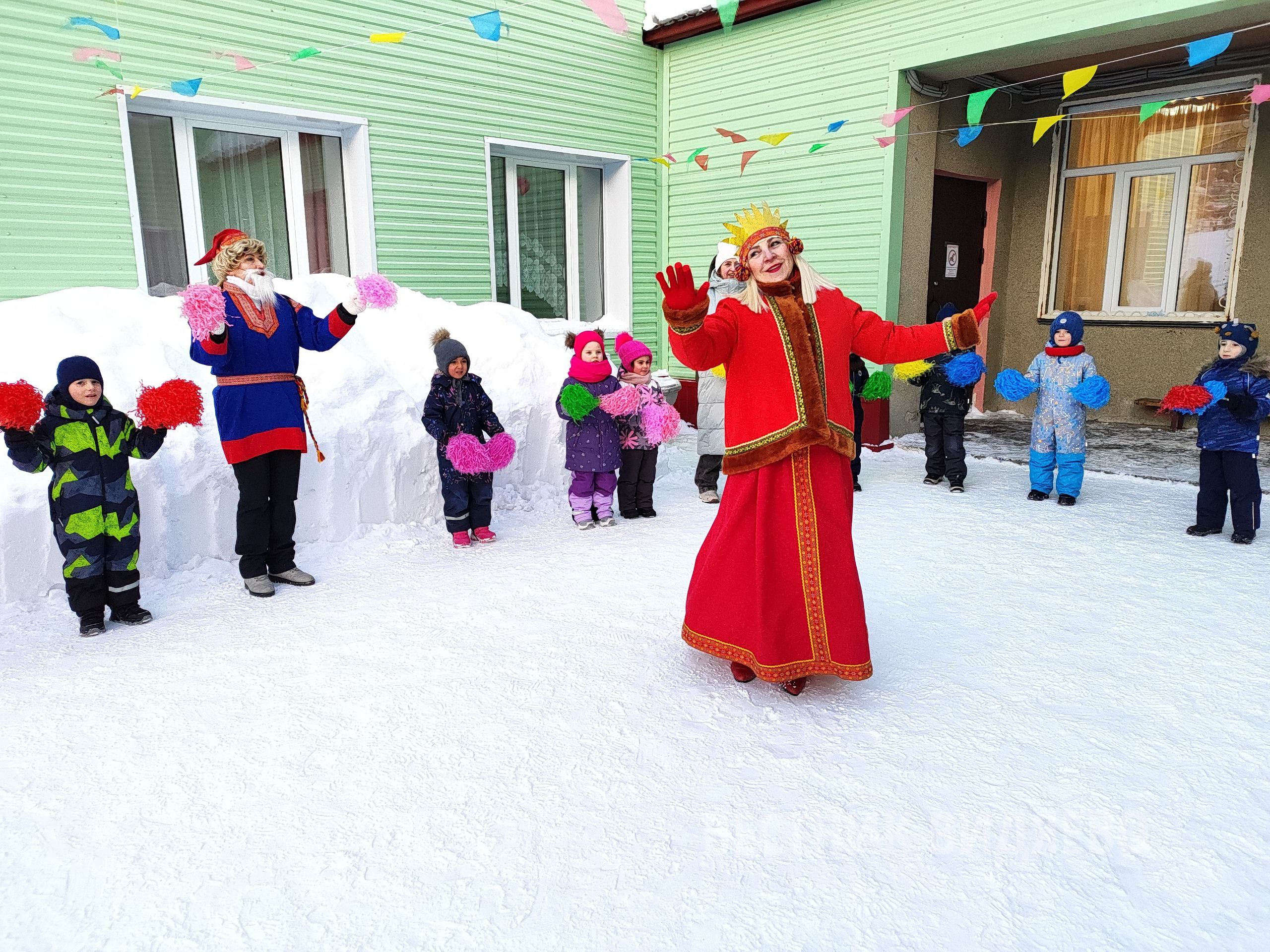 На мероприятие к детям и педагогам пришли гном Чакли, Снежная Королева и Полярная ночь, чтобы дружно расколдовать Солнце и увидеть его первые лучи.