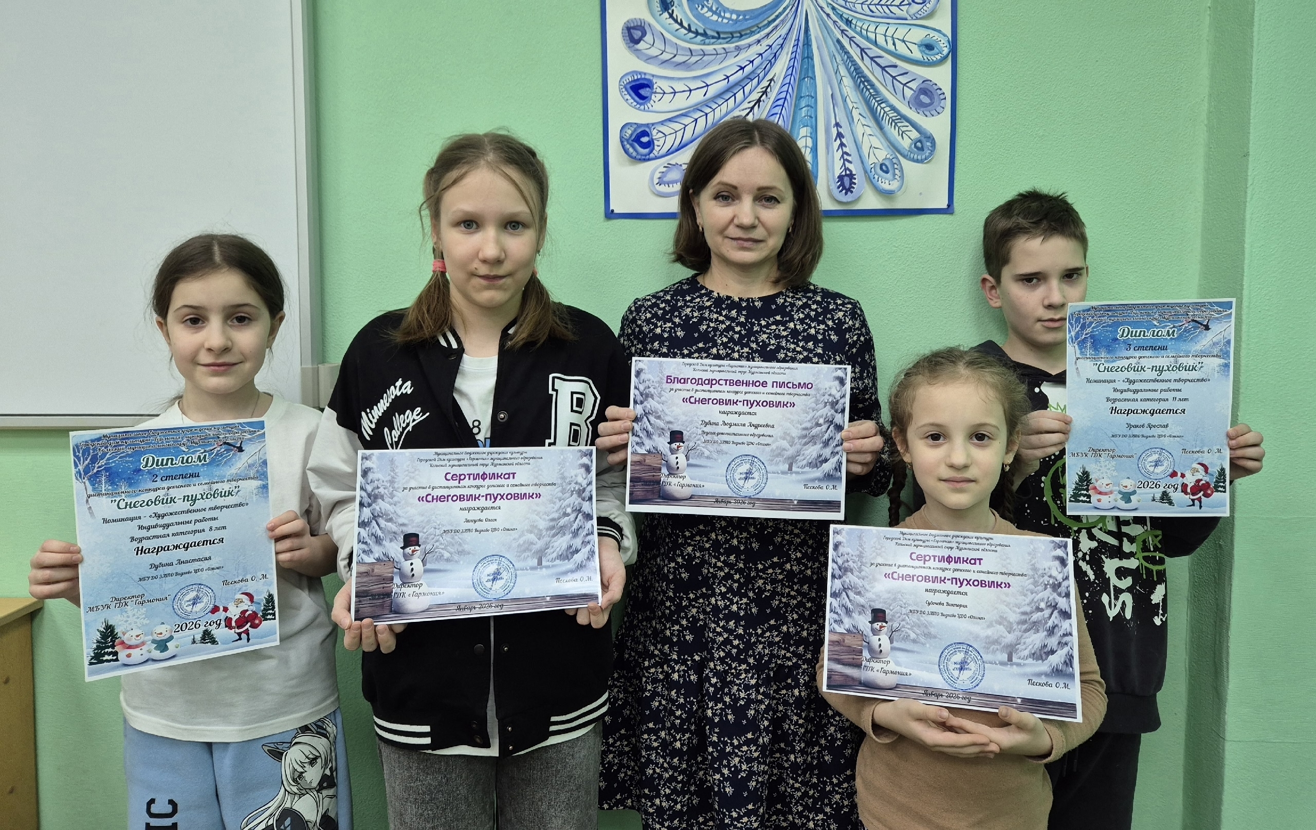 Обучающиеся объединений «Магия красок», «Юный художник» и «Волшебная палитра» Центра дополнительного образования «Олимп» под руководством педагога Людмилы Дубины приняли участие в дистанционном конкурсе детского и семейного творчества «Снеговик — пуховик», приуроченного ко Дню Снеговика.