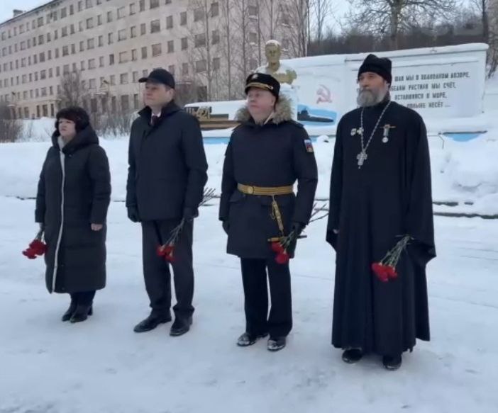 Продолжилось мероприятие церемонией возложения цветов к мемориальной доске в память о выпускниках школы, трагически погибших на атомной подводной лодке «Курск».