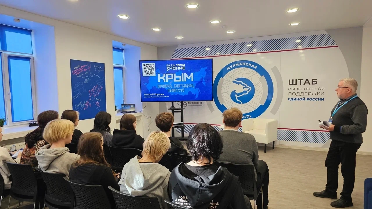 На площадке Штаба общественной поддержки «Единой России» состоялась познавательная лекция для студентов Мурманского индустриального колледжа. Лектор Российского общества «Знание» Виталий Королёв рассказал слушателям об исторических этапах развития Крыма, его значении для России, а также о культурных и цивилизационных связях, формировавшихся на протяжении веков.