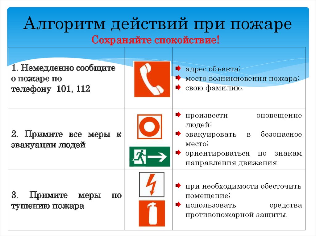 - прибывшему пожарному караулу сообщите об оставшихся в помещении людях;