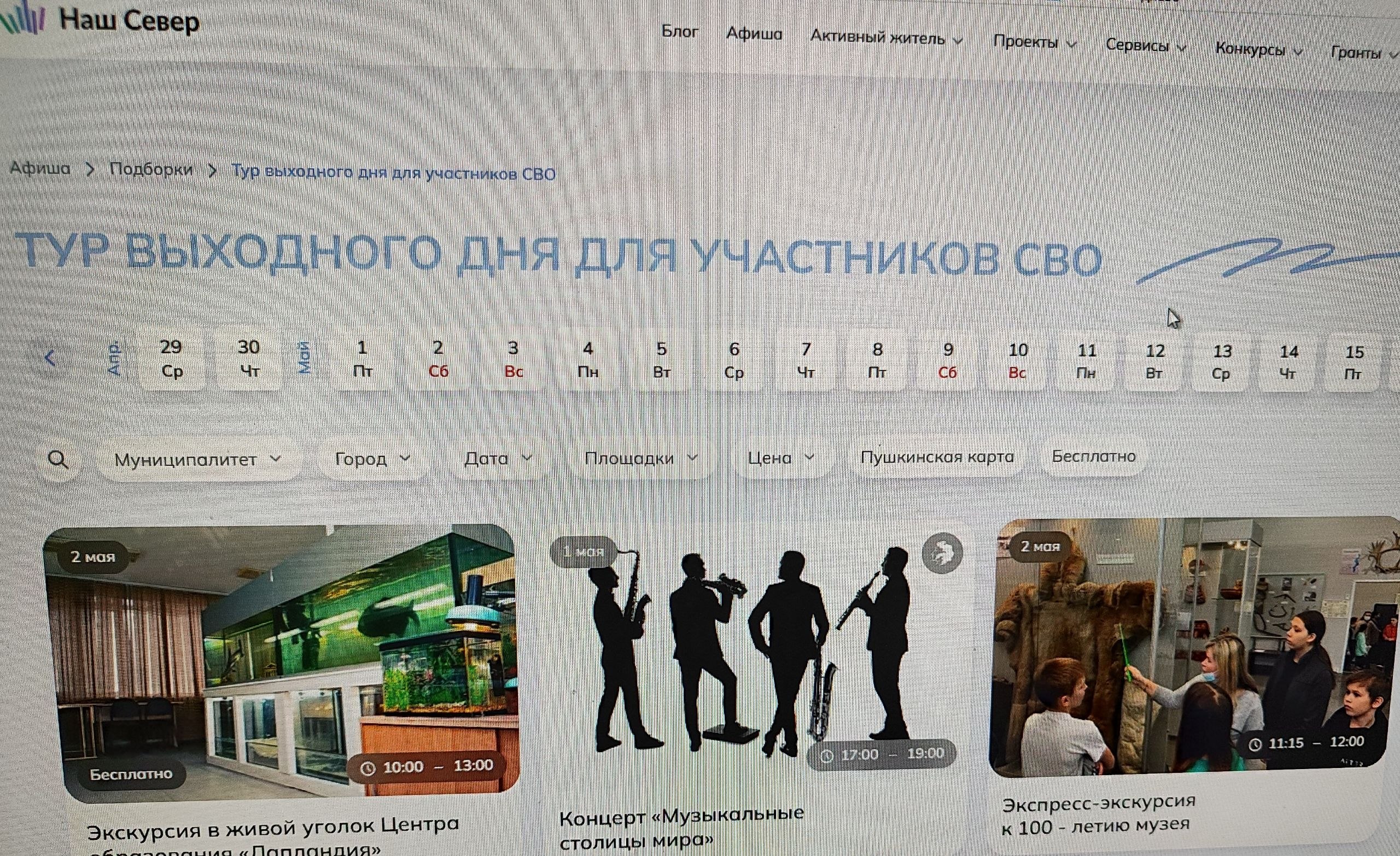 Разнообразные мероприятия проекта «Тур выходного дня. СВО» на главной странице Афиши на портале «Наш Север» доступны по ссылке https://nashsever51.ru/afisha/tag-502?filters=N4IgLghg5iBcCsAGATAXyA.