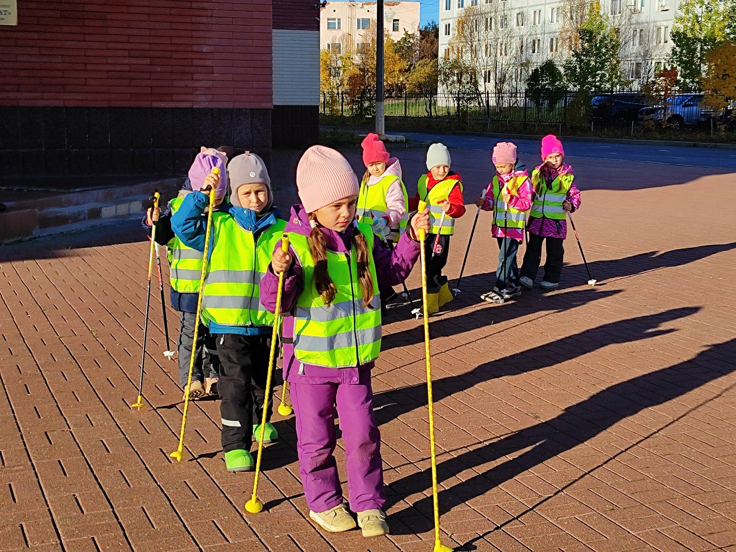 После энергичной разминки ребята вооружились палками «для скандинавской ходьбы» и отправились шагать на свежем воздухе.