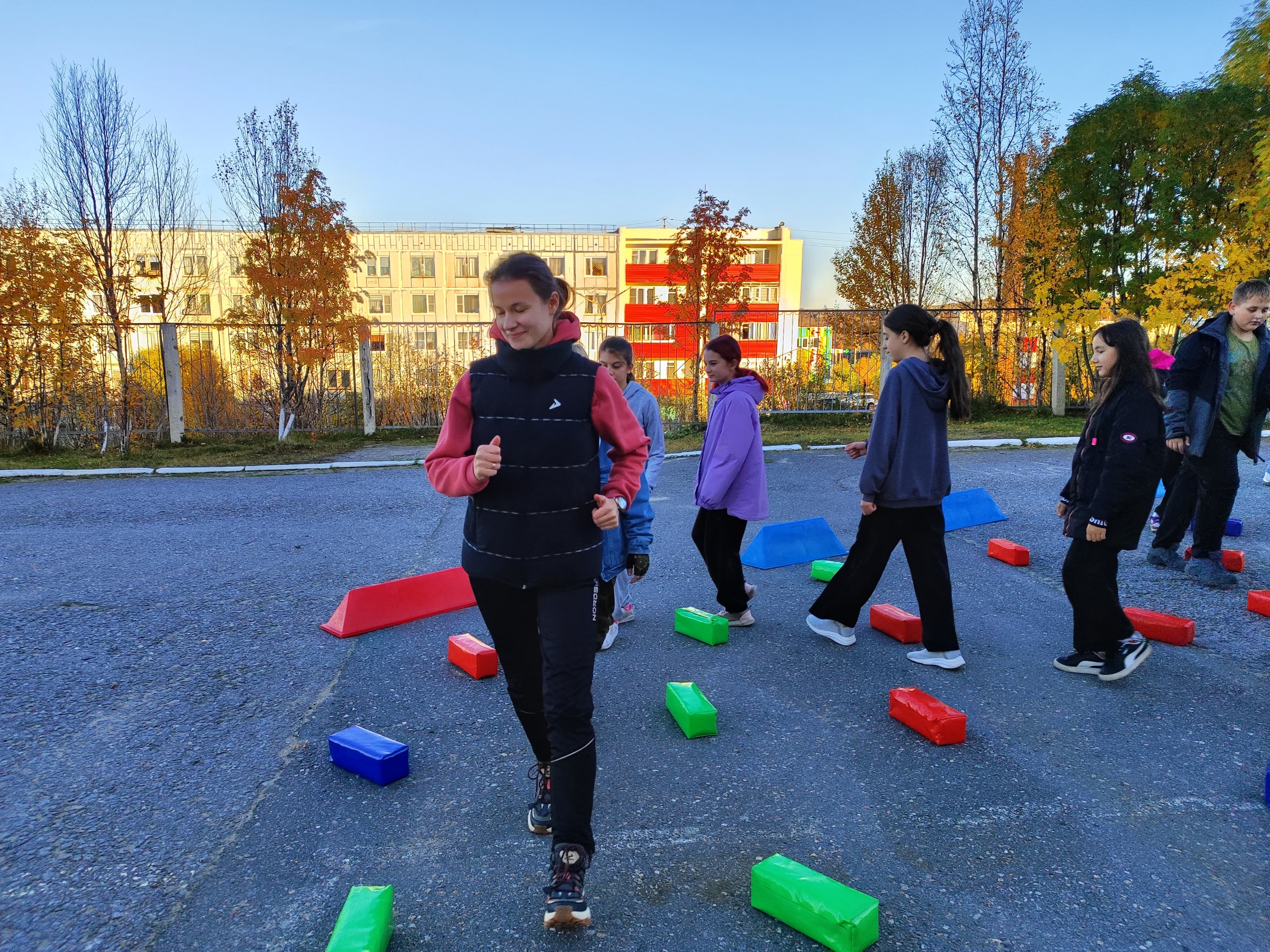 Школьники преодолели пеший маршрут с препятствиями: прошли приставным шагом по канату и лестнице, сохраняли равновесие на платформах, прыгали «по кочкам» и справились с лабиринтом.
